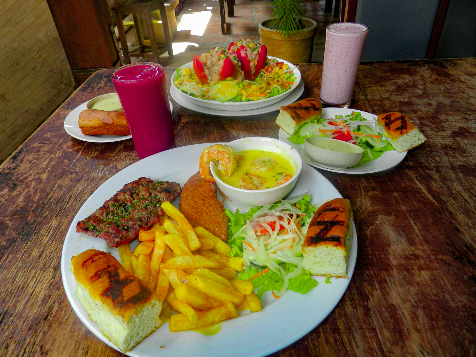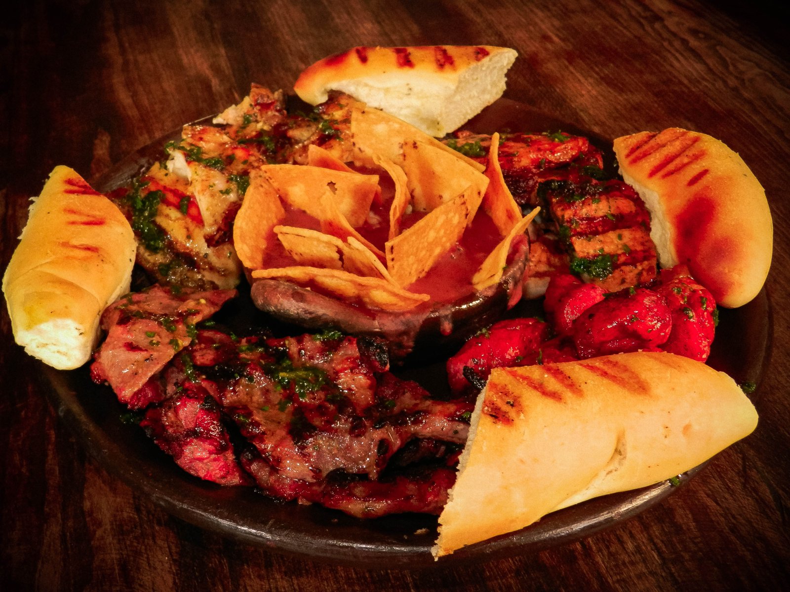 Deliciosa combinación de carnes a la parrilla con chorizo, acompañada de pan artesanal.