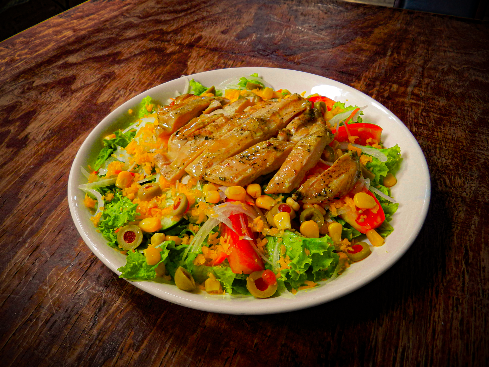 Deliciosa Ensalada de pollo acompañado de lechuga fresca, tomate y demas acompañantes